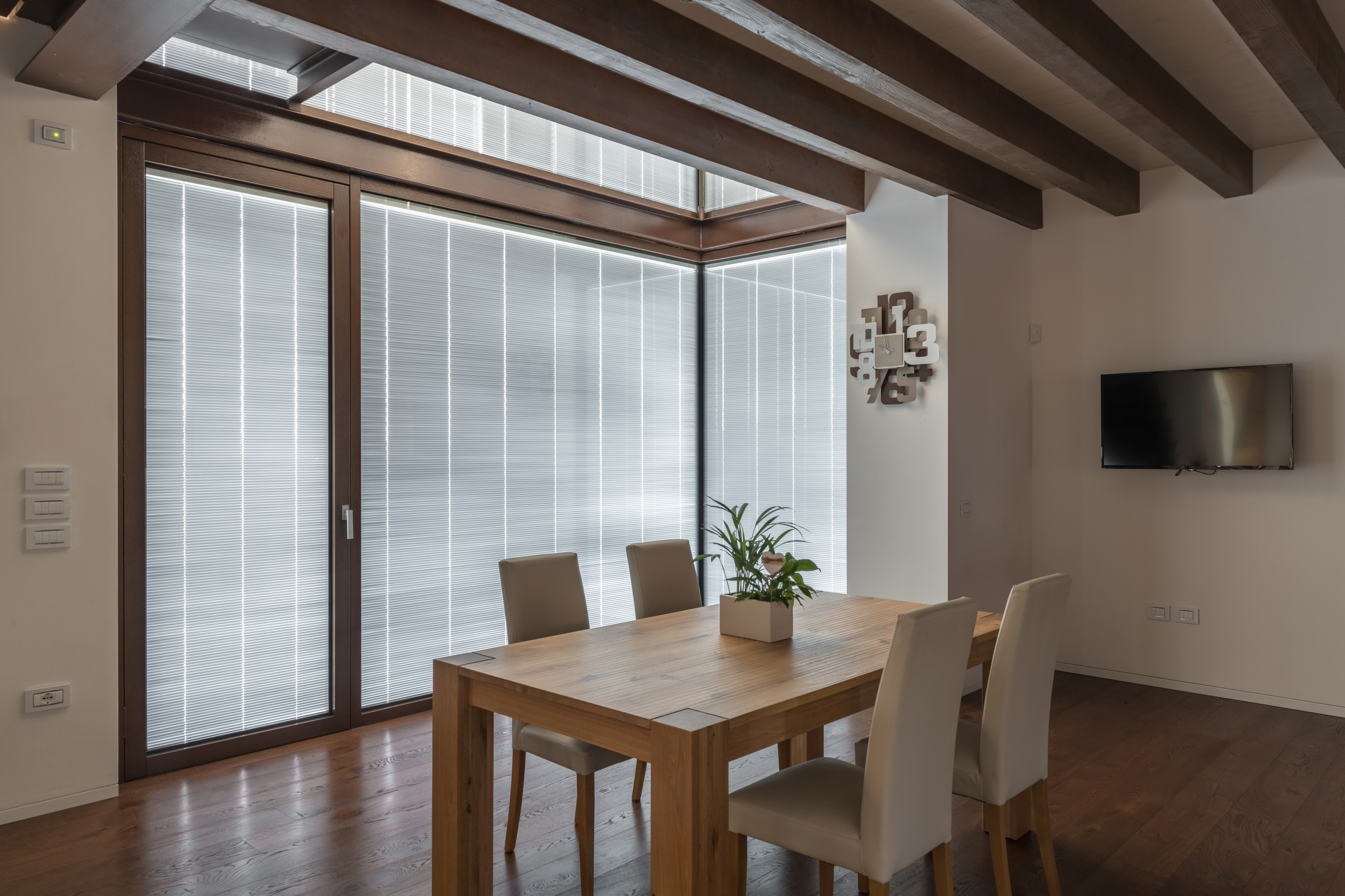 Odesy Line è il vero amico della privacy modulabile. La casa di ognuno di noi non è soltanto l'involucro che ci deve proteggere dal mondo esterno, ma lo scrigno della nostra intimità o come siamo abituati a definirla oggi, la nostra privacy. Il sentirsi protetti tra le mura di casa sembra in antitesi con l'esigenza di avere una casa sempre piu trasparente per un continuo dialogo con l'ambiente esterno. Il bisogno di trasparenza e privacy si alternano in funzione delle diverse attività svolte all'interno della casa. Evitare riflessi sullo schermo quando si guarda la TV o si lavora con il computer, chiudere agli sguardi altrui un bagno o una nicchia della doccia, eliminare l'abbagliamento dei raggi solari che entrano attraverso una finestra posta sopra il lavello in cucina, oscurare completamente una camera da letto, godere della completa trasparenza per ammirare un panorama esterno, beneficiare della luminosità naturale anche quando il cielo è coperto, senza dover accendere la luce artificiale: tutte queste esigenze possono essere soddisfatte scegliendo Odesy Line, la schermatura racchiusa e protetta nel vetro, perfettamente modulabile grazie alle sottili ed eleganti lamelle che si possono abbassare alzare e orientare.
